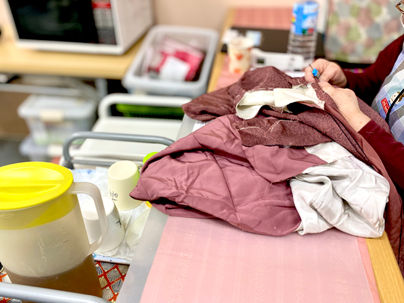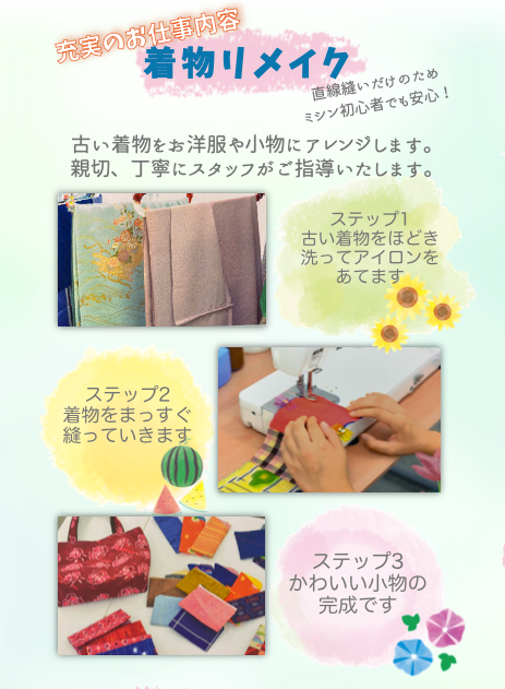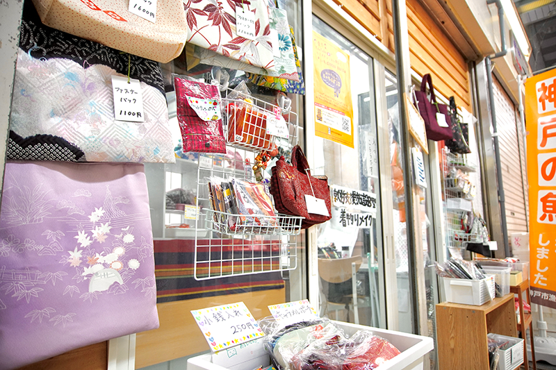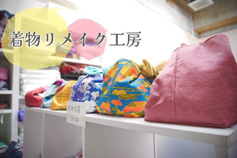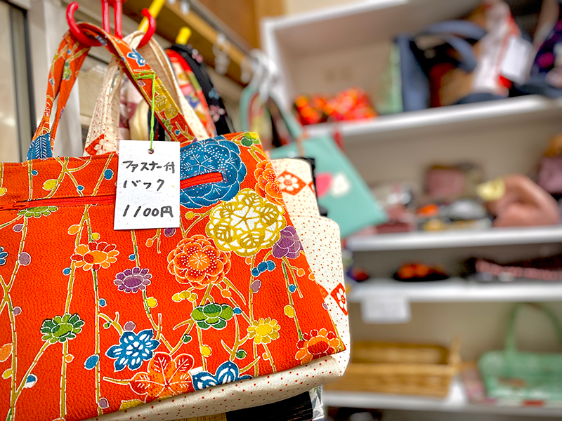 北市場音楽堂では古い着物をお洋服や小物にアレンジし、県内の販売所等で販売しています。本来は捨てられるはずの美しい着物たちが、素敵な用品に生まれ変わります。